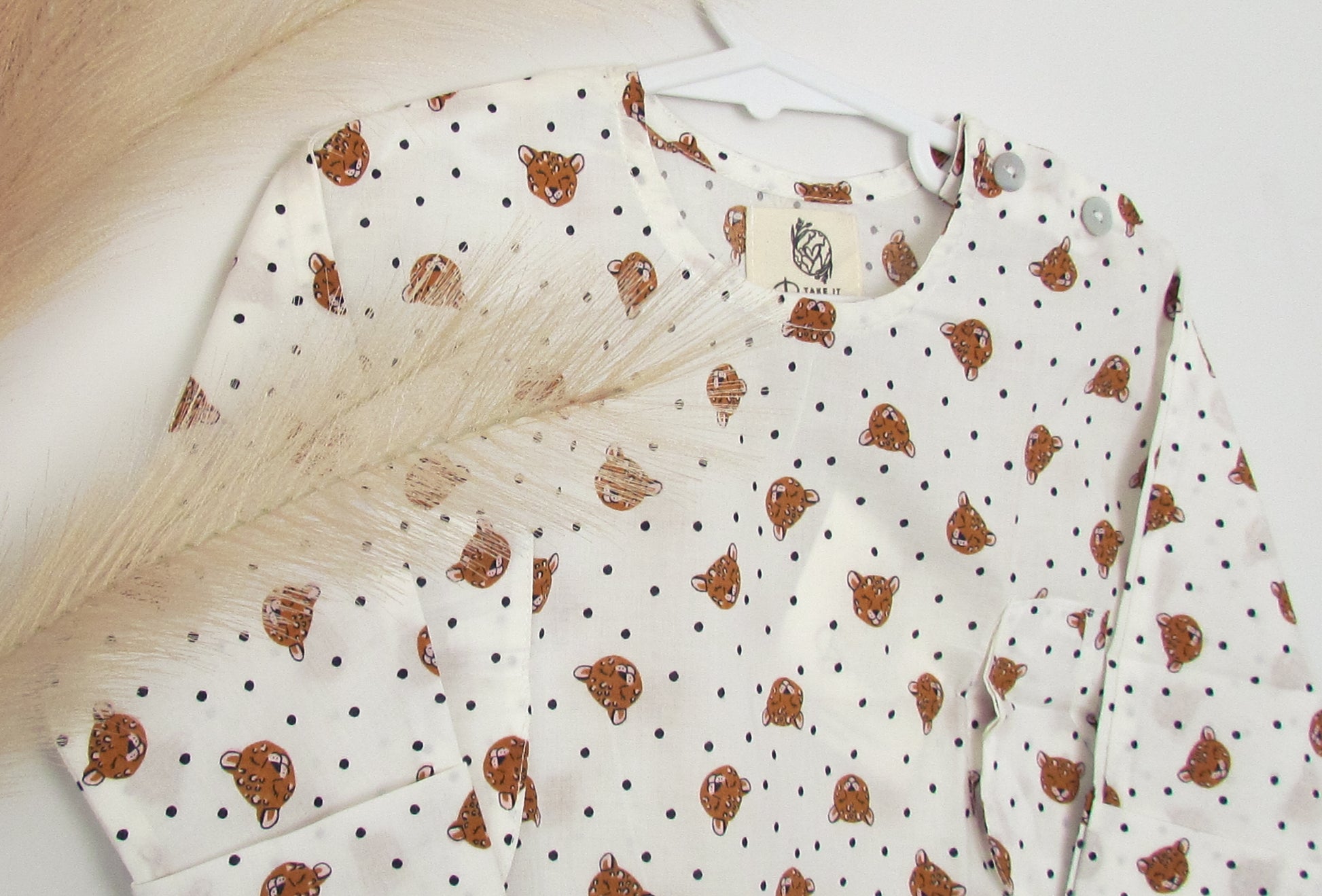 Stay wild with our Cub-Face Top! Made from cotton, this top features an adorable animal print and little pockets. Perfect for making a statement and adding a playful touch to any outfit.